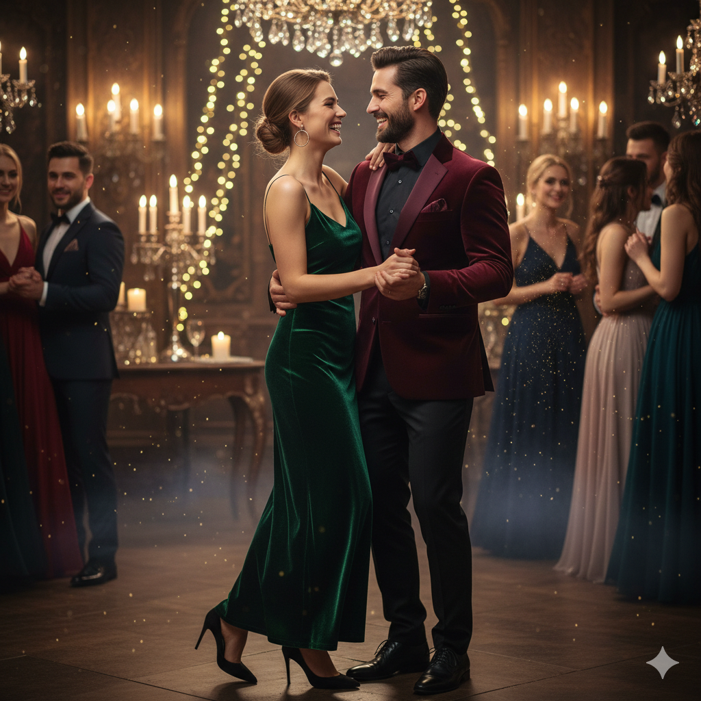 • Dla Niej: Postaw na sukienkę z aksamitu w głębokim, szlachetnym kolorze. Butelkowa zieleń, bordo lub granat będą strzałem w dziesiątkę. Wyobraź sobie model o kroju “slip dress” na cienkich ramiączkach lub bardziej zabudowaną kreację z długim rękawem. Do tego wystarczą delikatne, złote kolczyki koła i klasyczne czarne szpilki.